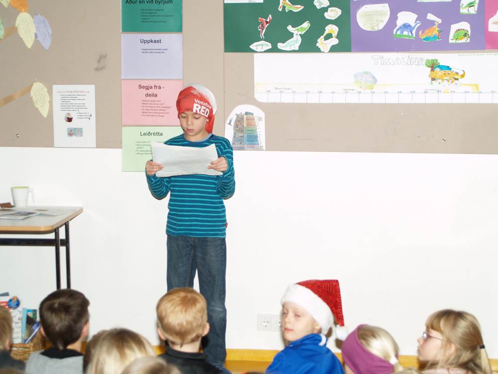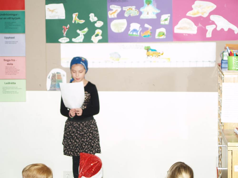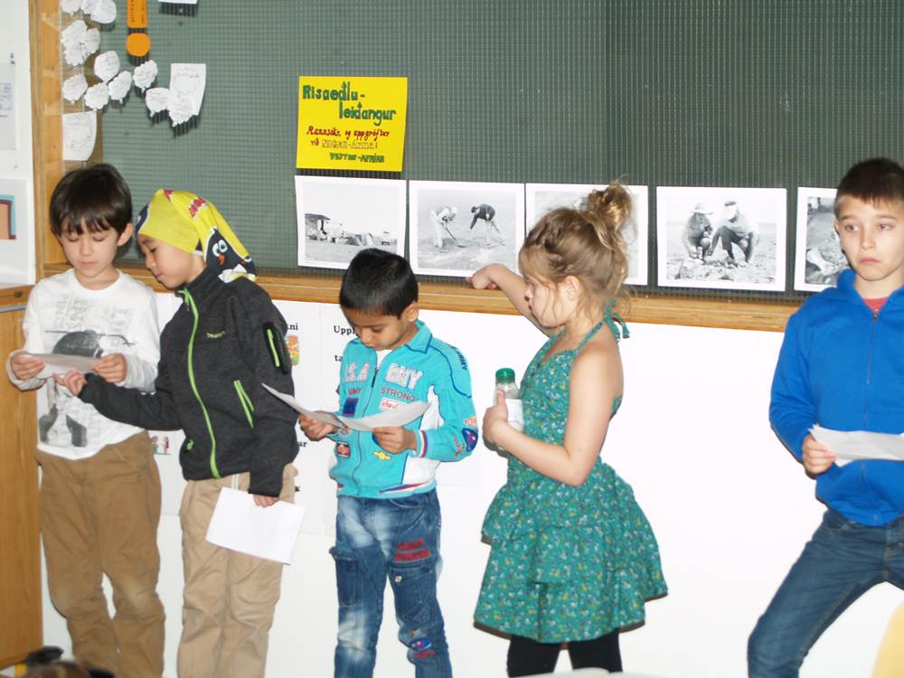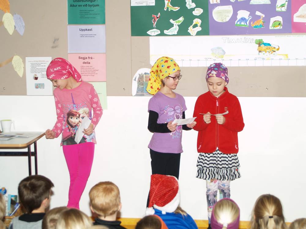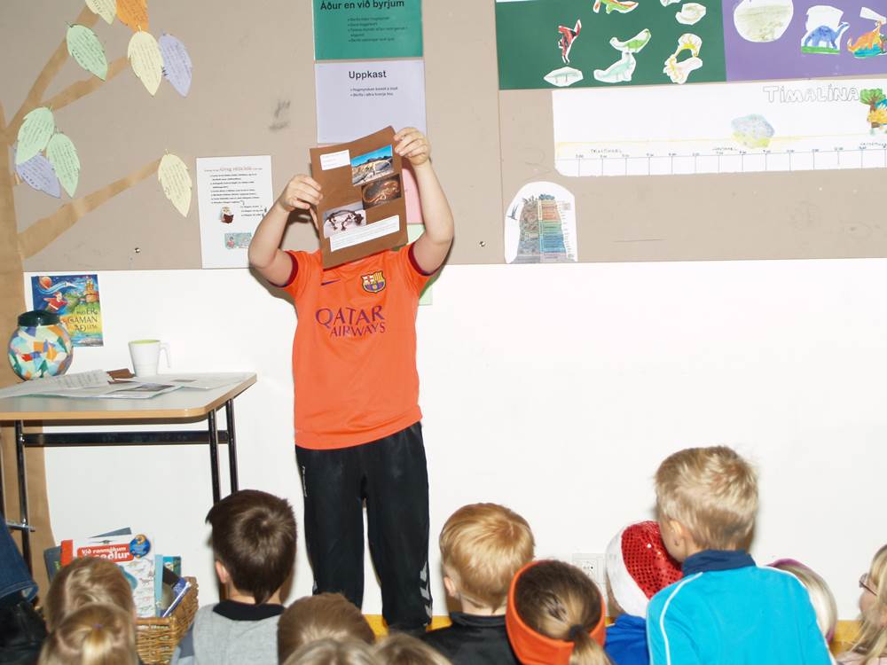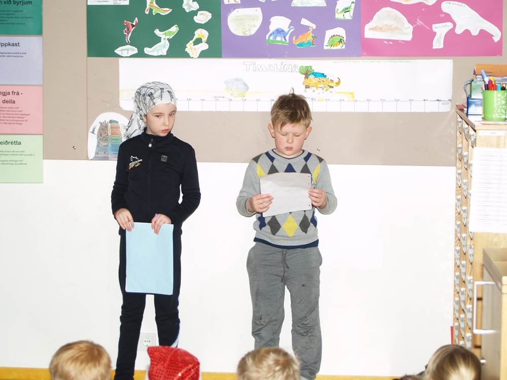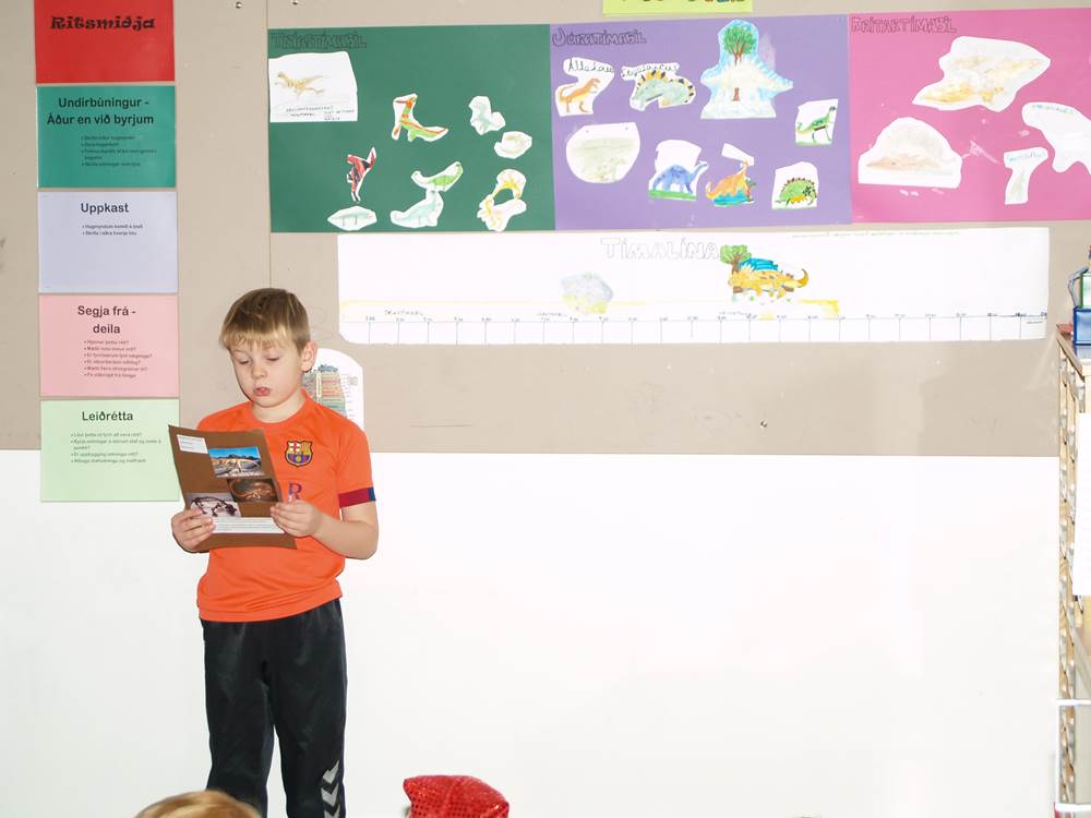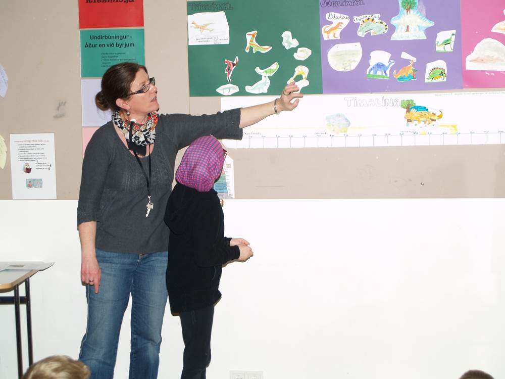 Nemendur í Alþjóðaskólanum buðu nemendum í 1. – 2. bekk á kynningu um risaeðlur á föstudaginn.  Þetta var skemmtileg kynning þar sem nemendur úr Alþjóðaskólanum voru búnir að kynna sér hinar ýmsu risaeðlur og líf þeirra hér á jörðinni fyrir milljónum ára.  Nemendur hlustuðu að athygli á þessa fróðlegu og skemmtilegu kynningu. Þetta er eitt af frábæru samstarfi þessara tveggja skóla sem starfa í sama húsnæði