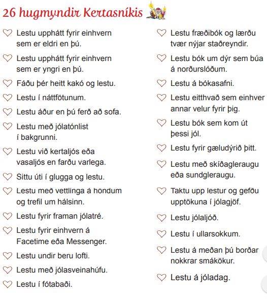 "Það er mjög notalegt að kúra með bók í skammdeginu og með þátttöku þinni í jólasveinalestrinum færðu einmitt tækifæri til þess. Í ár er lögð áhersla á að keppast ekki við að lesa sem flestar blaðsíður heldur að njóta lestrarins. Kertasníkir ætlar að hjálpa til en hann stingur upp á 26 hugmyndum sem þú getur nýtt þér til að gera jólasveinalesturinn skemmtilegan."
